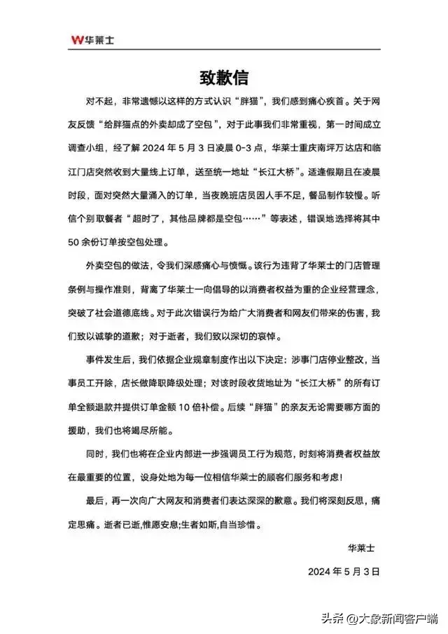 华莱士:10倍赔偿长江大桥订单 当事员工开除 店长降职降级