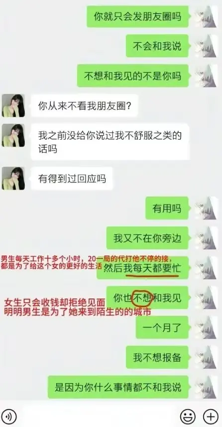 看看这些聊天记录,可以真切感受到胖猫在这段感情中的卑微!他每天工作十几个小时,20元一局的代打不停的接,只为给女友更好的生活。而女生只会收钱却拒绝见面。即便这样胖猫还真的认为是自己的问题,一直在反思自己,一直在挽留 。