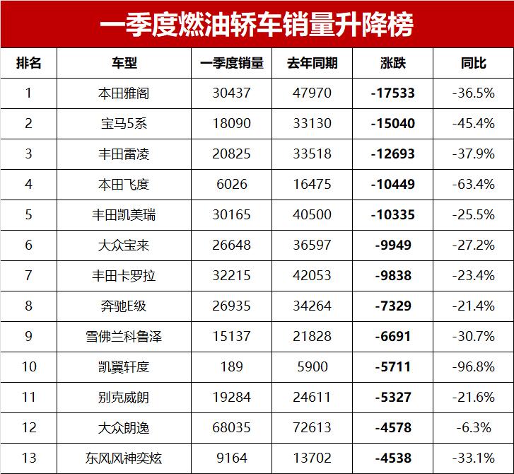 而在轿车销量下跌榜方面,一季度零售销量同比下降超过1万辆的轿车共有五款车型,来自日系的雅阁、雷凌、飞度和凯美瑞跌幅都超过1万辆。其中,本田雅阁领跌,一季度销量同比减少17533辆,自去年5月全新一代雅阁上市之后,雅阁销量一直都不如上一代车型。