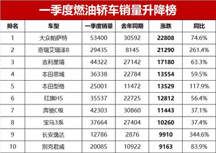 具体来看,一季度销量同比增长超过1万辆的燃油轿车共有八款车型。其中,大众帕萨特和奇瑞艾瑞泽8销量均比去年同期增长超过2万辆,分别达到22808辆和21290辆。当然,艾瑞泽8销量的大涨,与去年同期艾瑞泽8刚刚上市销量基数低有关。