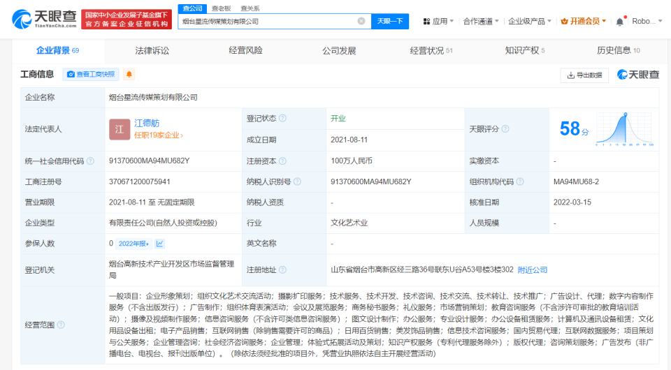 天眼查App显示,烟台星流传媒策划有限公司成立于2021年8月,法定代表人为江德舫,注册资本100万人民币,由沈文君、江德舫分别持股70%、30%。2022年报显示,该公司参保人数为0。值得一提的是,该公司股东沈文君即为“参哥”。沈文君名下共关联30余家企业,其中17家为存续或开业状态,包括山东明凡投资有限公司、上海壹联佰教育科技有限公司、烟台星流传媒策划有限公司、杭州参哥出品餐饮集团有限公司、烟台御参商贸有限公司等。商业履历信息显示,沈文君初期投资的企业多为商贸、餐饮,后期逐渐涉足文化传媒、教育、网络技术等。