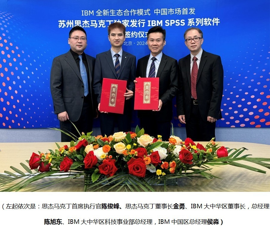 2024年7月1日,IBM中国宣布将拓展与苏州思杰马克丁软件有限公司的合作。即日起,基于协议,IBM中国的创新合作伙伴苏州思杰马克丁软件有限公司(以下简称思杰马克丁)全面独家负责IBM SPSS系列产品在中国大陆区域的转售模式的发行业务。