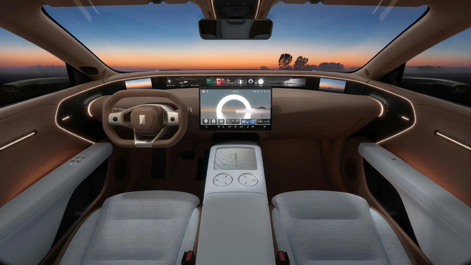 同时,在中控台大屏幕下方取消了物理按键,并重新设计了出风口和中控台部分的造型。此外,新车还配备独特的氛围灯系统,通过贯穿整个带鱼屏以及门边饰板进行点缀,营造出非常特别的效果。