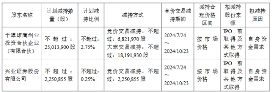 公告显示,平潭雄鹰拟通过集中竞价交易方式减持公司股份不超过6,821,970股,减持比例不超过公司总股本的0.75%,并通过大宗交易方式减持公司股份不超过18,191,930股,减持比例不超过公司总股本的2%,减持价格按市场价格确定,计划自公告披露日起15个交易日后3个月内进行,减持期间为2024年7月24日至2024年10月23日。