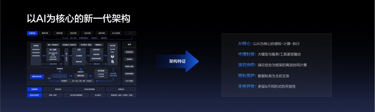 整体架构呈现出AI核心、代理封装、端云协同、隐私保护、全面开放等五大特性,通过“助理、助手”的角色参与、帮助用户更快、更好的完成工作任务,从而达到提升客户运营效率、降低运营成本的目的,也有效解决了大模型使用门槛的问题。