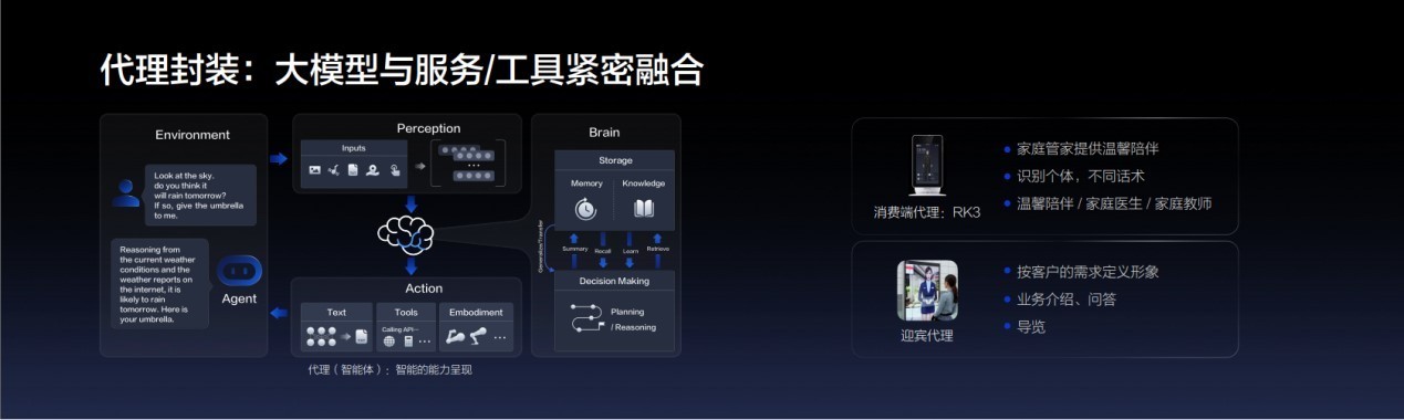 如果AI是内核,那代理则是整个架构的“皮肤”。萤石将大模型与服务、工具紧密融合实现代理封装,好处显而易见:一是更容易被理解和使用,协调背后复杂的逻辑提供更易用的交互/API;二是能够与业务更好结合。以萤石家庭助理机器人RK3为例,作为萤石第一个代理,它能够识别不同对话的角色和个体,再自主匹配不同的话术,让用户有与“人”交流的既视感。另一个迎宾代理也现身当天发布会现场获得不少开发者的好评;据了解,迎宾代理已可以按客户需求定义形象,满足业务介绍、文档、导览等需求。