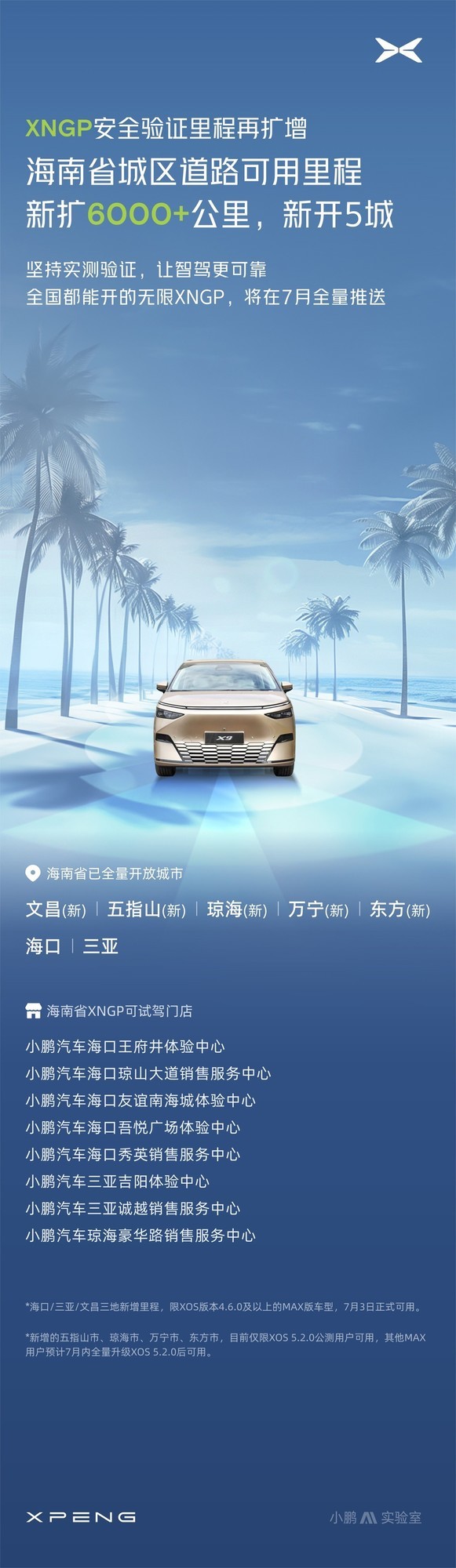 小鹏汽车官方宣布,本周在海南地区新开设了5个城市的服务网点,并且海南城区智驾安全验证的里程超过了6000公里。此外,南昌市的XNGP城区智驾安全验证的里程也扩大了超过2800公里。