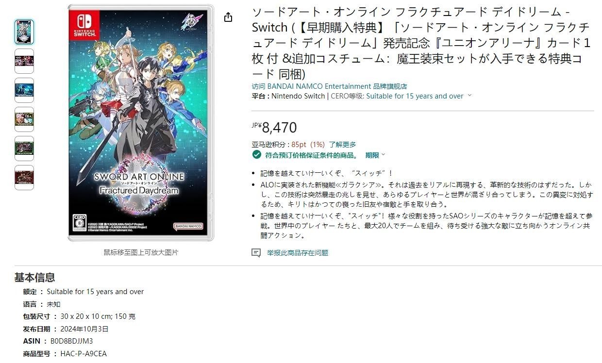 在正式公布之前,电商平台亚马逊已经泄露了,一款备受期待的角色扮演游戏《刀剑神域:碎梦边境》将于10月3日登陆Switch平台。该游戏是为庆祝《刀剑神域》系列作品诞生十周年而推出的第二款纪念作品。在游戏中,系列中的角色们将穿越自己的记忆,参与到一场激烈的战斗中来。这是一款支持最多20名来自全球玩家组队、共同对抗强大敌人的在线多人动作游戏。