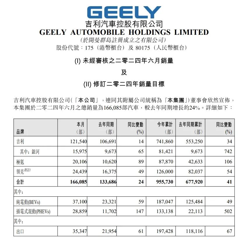 吉利汽车近日公布了2024年6月未经审核的销售数据,其总销量达到166,085部汽车,同比增长约24%。具体来看,该公司旗下的银河品牌在该月份的销售量为15,975部,同比增长了65%;极氪品牌共计销售了20,106部汽车,同比增长了89%;而领克品牌则售出了24,439辆汽车,相较于去年同期增长了49%。