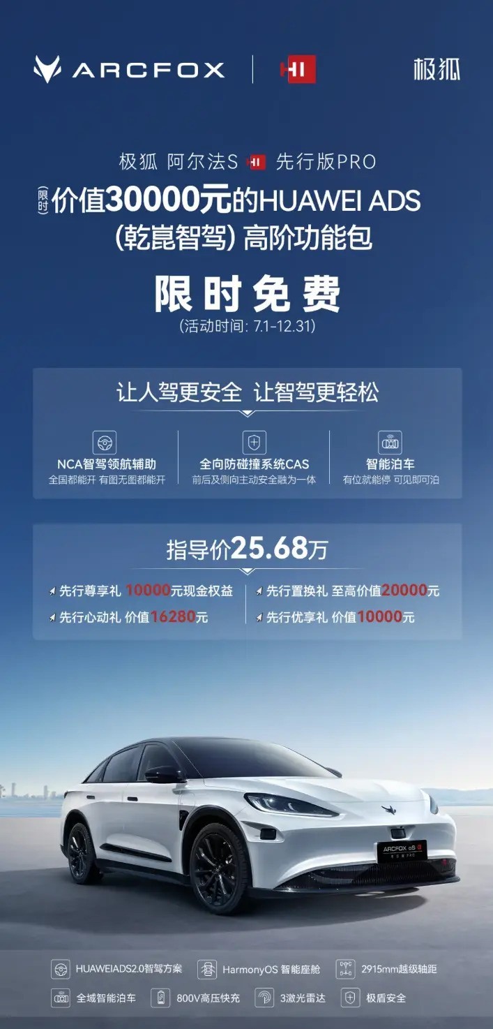 7月2日,极狐汽车宣布,其阿尔法S先行版PRO车型将限时免费搭载价值3万元的华为乾崑智驾高阶功能包。该活动时间为2024年7月1日至12月31日。