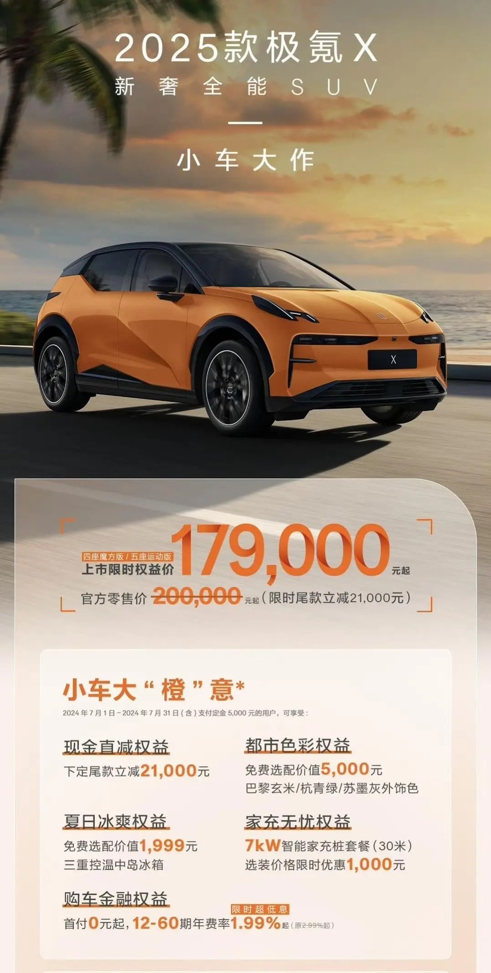 2025款极氪X于7月1日正式上市,新车基于SEA浩瀚架构打造,定位紧凑型SUV。该车共推出3款配置,售价为20.00-22.00万元,限时权益价179,000元起。虽然外观上没有太大改变,但提供了迈阿密橙等多种配色可选择。