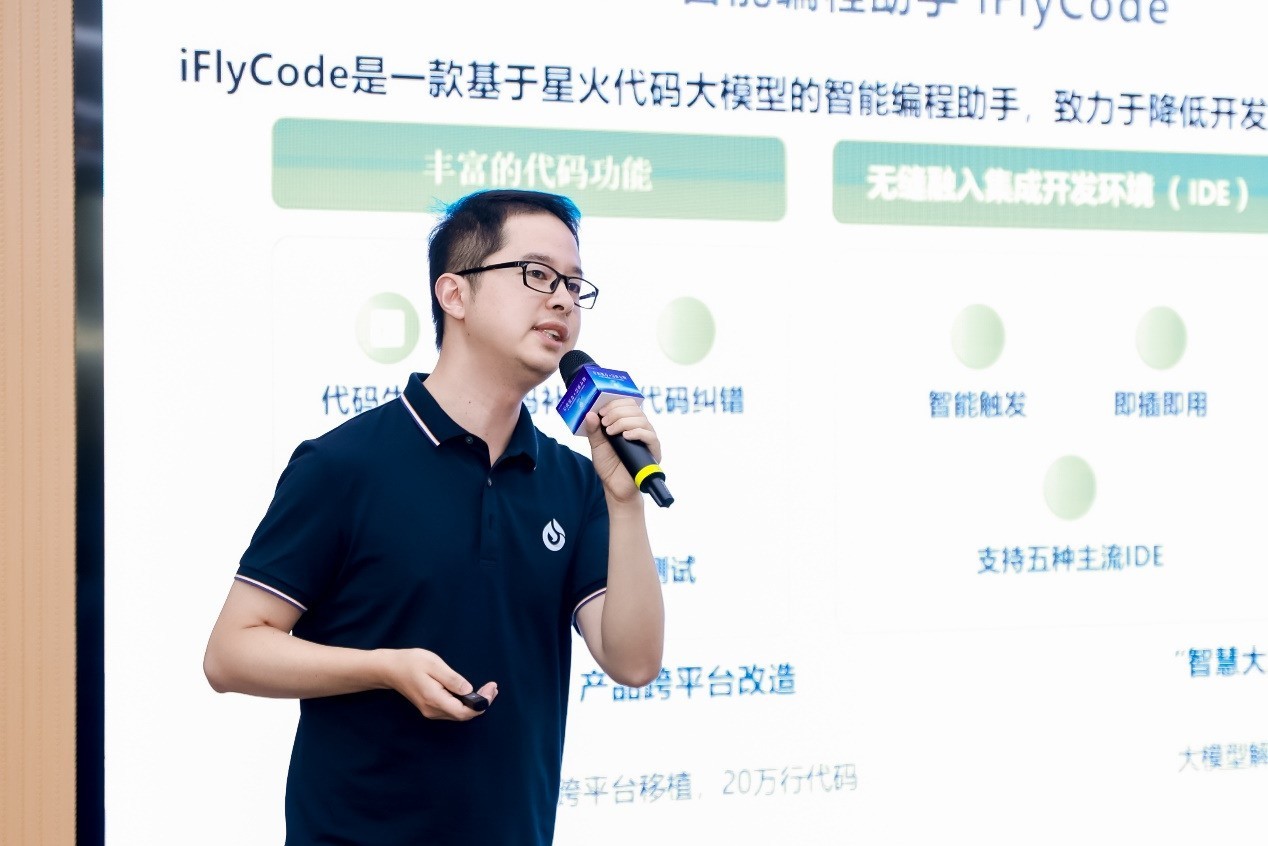 紧随其后的是一场灵感与技术交融的分享。科大讯飞云平台行业创新服务部运营总监王东昊先生首先发表了主题演讲,深入剖析了星火大模型在推动企业数智化转型中的关键作用,展示了科大讯飞如何通过创新服务方案,利用AI技术全面提升企业竞争力。资深产品专家朱超先生详细介绍了iFlyCode编程助手。这款基于代码大模型的工具,通过智能编程插件显著提升了研发效率,降低了技术门槛,为软件开发领域带来了革命性的变革。AI人格业务线负责人涂康宏先生则阐释了AI人格技术在提供沉浸式交互体验、加强用户与IP情感链接方面的潜力,他展望了AI人格在游戏、文旅、教育等多个行业应用的广阔前景。