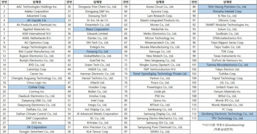 三星电子近日公布了2024年合作公司名单,这份名单显示,该公司零部件采购额的80%以上来自113家公司。其中有11家公司是新增加的,同时也有11家公司被剔除出去。