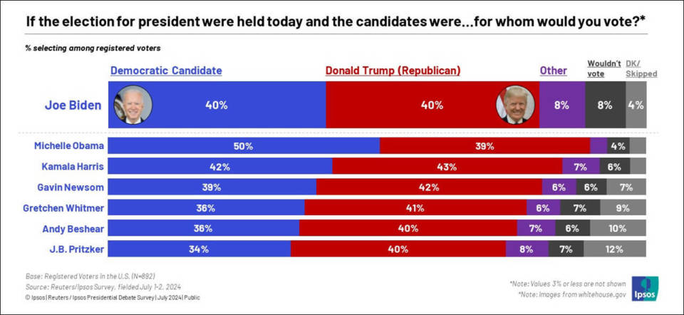 参与民调的其他潜在民主党候选人还包括:美国副总统卡玛拉·哈里斯(Kamala Harris)、加利福尼亚州州长加文·纽森(Gavin Newsom)、密歇根州州长格雷琴·惠特默(Gretchen Whitmer)、肯塔基州州长安迪?贝希尔(Andy Beshear)、伊利诺伊州州长J.B.普利兹克(J.B.Pritzker)。但他们皆“不敌”特朗普,表现甚至比拜登更差。