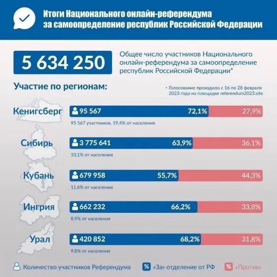乌克兰国家资金支持运营的英语新闻网站The Gaze曾报道,由Free Nations of PostRussia Forum(FNRF)倡议并于2023年2月16日至28日发起了一项“关于俄罗斯联邦共和国自决的全国在线公投”。报道称,共有560万人投票,结果如下:柯尼斯堡(加里宁格勒市的原名)有72.1%支持脱离莫斯科独立,27.9%反对;英格里亚:66.2%支持独立,33.8%反对;库班:55.7%支持独立,44.3%反对;西伯利亚:63.9%支持独立,36.1%反对;乌拉尔:68.2%支持独立,31.8%反对。