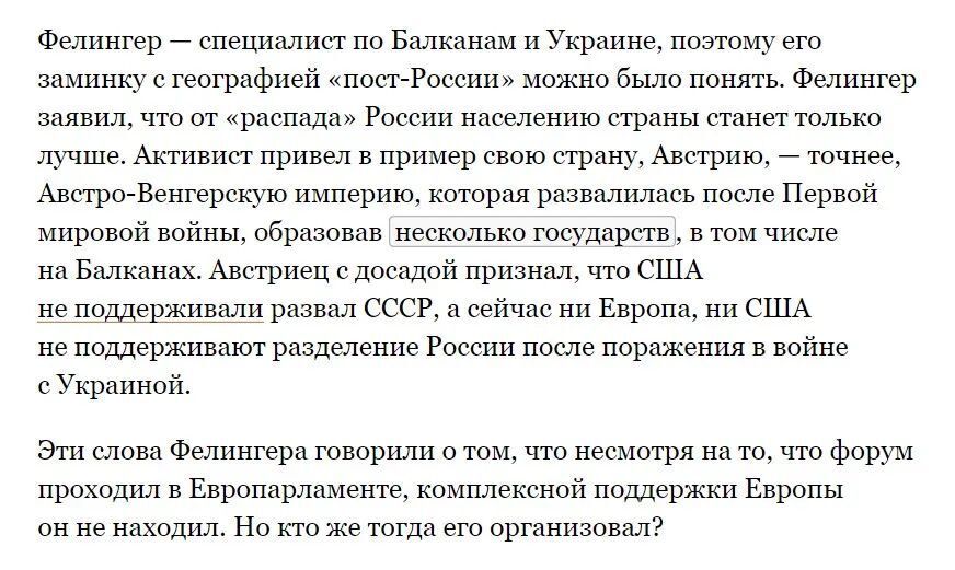 2023年1月31日,FNRF于欧洲议会大厦举行了为期一天的“俄罗斯自由人民论坛”,会议试图制定一个令俄罗斯“国家崩溃”的计划并解决俄罗斯的核武器问题。俄英双语媒体Meduza的参会报道指出,该会议似乎想要呈现给记者看的是,俄罗斯“征服、殖民和种族灭绝”的“阴谋”正在成为现实,“然而,我们清楚地看到这些计划远未实现。”在会议中,一位巴尔干和乌克兰问题专家Fehlinger承认,“美国不支持苏联解体,现在欧洲和美国都不支持乌克兰战争失败后分裂俄罗斯。而Fehlinger的这番话表明,尽管论坛在欧洲议会大厦举行,但并没有得到欧洲的全面支持。”