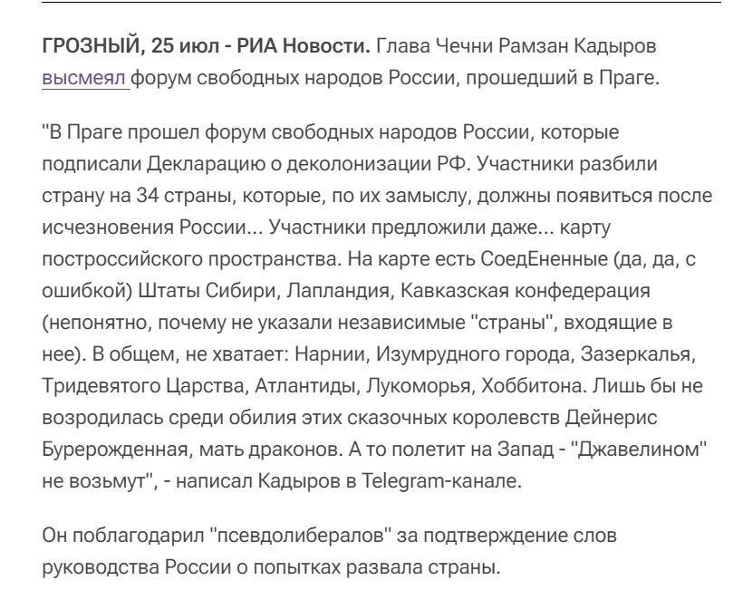 但需要指出的是, FNRF是一个于2022年俄乌冲突前后开始活跃的论坛,已经举行了多次会议,主要参与者为流亡的俄罗斯分离主义者以及一些外国同情者,该论坛主张俄罗斯解体。此前,俄新社报道,车臣领导人发布电报评价了FNRF于2022年7月举办的一届“俄罗斯自由人民论坛”称,“伪自由主义者”证实了俄罗斯领导人关于那些企图瓦解国家的言论。