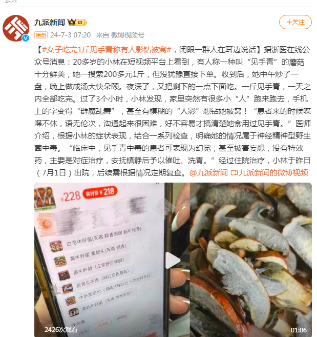 据浙医在线公众号消息:20多岁的小林在短视频平台上看到,有人称一种叫“见手青”的蘑菇十分鲜美,她一搜索200多元1斤,但没犹豫直接下单。收到后,她中午炒了一盘,晚上做成汤大快朵颐。夜深了,又把剩下的一点下面吃。一斤见手青,一天之内全部吃完。过了3个小时,小林发现,家里突然有很多小“人”跑来跑去,手机上的字变得“群魔乱舞”,甚至有模糊的“人影”想钻她被窝!“患者来的时候喋喋不休,语无伦次,沟通起来很困难,好不容易才搞清楚她食用过见手青。”