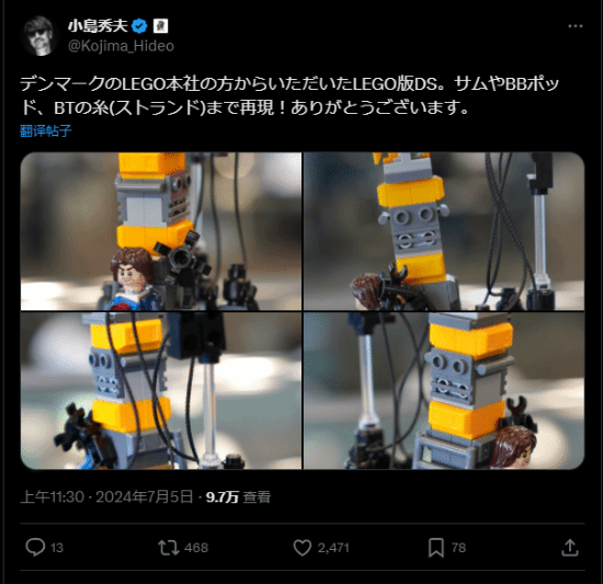 小岛秀夫在推特上分享了一组丹麦乐高总部寄送的《死亡搁浅》主题积木照片。照片中,一组高度还原的角色形象引起了人们的关注。这座雕像的设计灵感来源于游戏中的“山姆”角色,他背着巨大的货物,怀里还抱着BB的育婴箱,身后跟着一群BT(生物恐怖袭击兵器)。