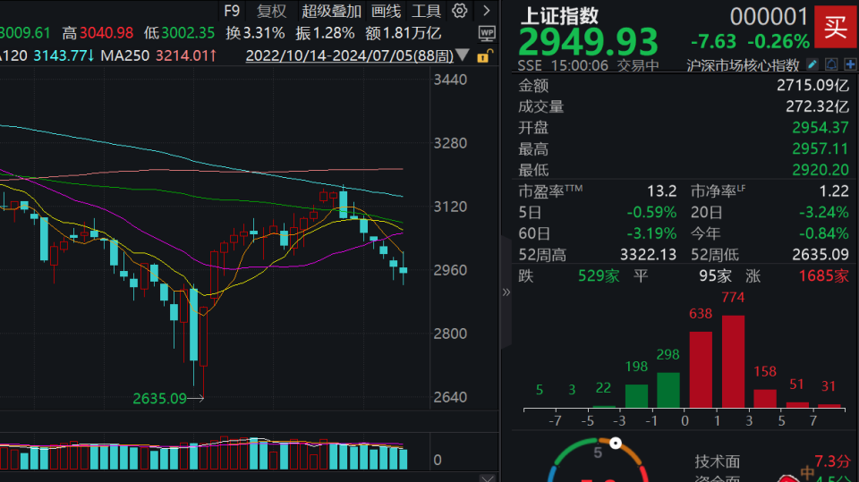 7月5日,A股三大指数探底回升。早盘市场人气低迷,沪指最低跌至2920.2点,创今年3月以来新低。午后市场“深V”反弹,沪指跌幅收窄,深成指、创业板指翻红。