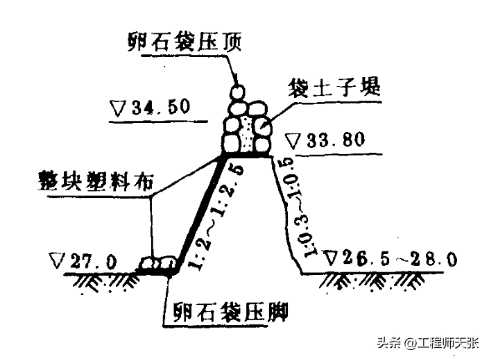 还有一种就是塑料布护堤防渗。这种做法适合汛情紧急高水位时的情况。堤脚、堤顶及塑料布结合处用袋装卵石袋压实,防止洪水冲洗堤坝迎水面。