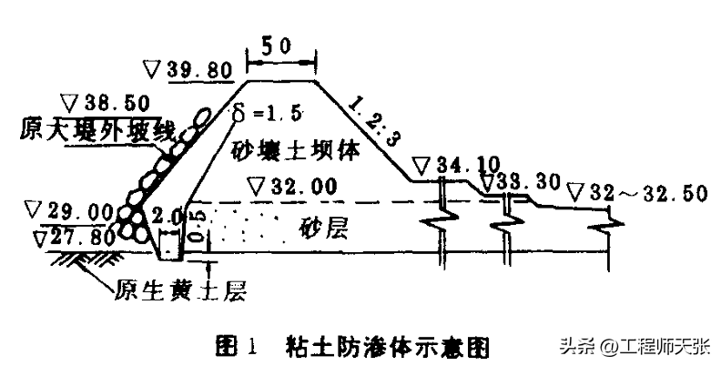 对于浅层砂基堤段,他们采用过粘土斜墙的防治措施。下图中左侧是湖内(堤外),在非汛期低水位时,大堤外坡线上使用垂直防渗体和粘土斜墙进行防渗。简单讲这种做法就是“迎水面去挡”,而不是“背水面去堵”,大家都熟悉这个道理,前者会更有效。