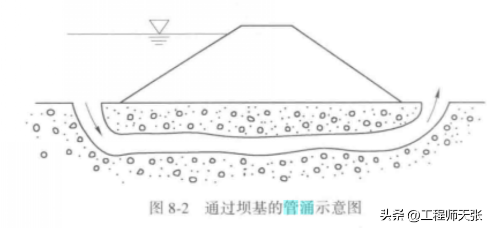 管涌是指在渗流作用下,一定级配的无黏性土中的细小颗粒,通过较大颗粒形成的孔隙发生移动,最终在土中形成与地表贯通的通道,从而引发土工建筑物或地基发生破坏的现象。下图就是堤坝工程发生管涌的示意图。
