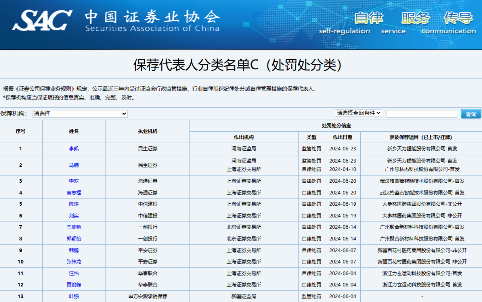 从针对保代的处罚情况来看,中证协官网保荐代表人C类(处罚处分类)名单显示,2024年上半年有67名保代被处罚,涉及21家券商。2023年全年共有87名保代进入该名单。