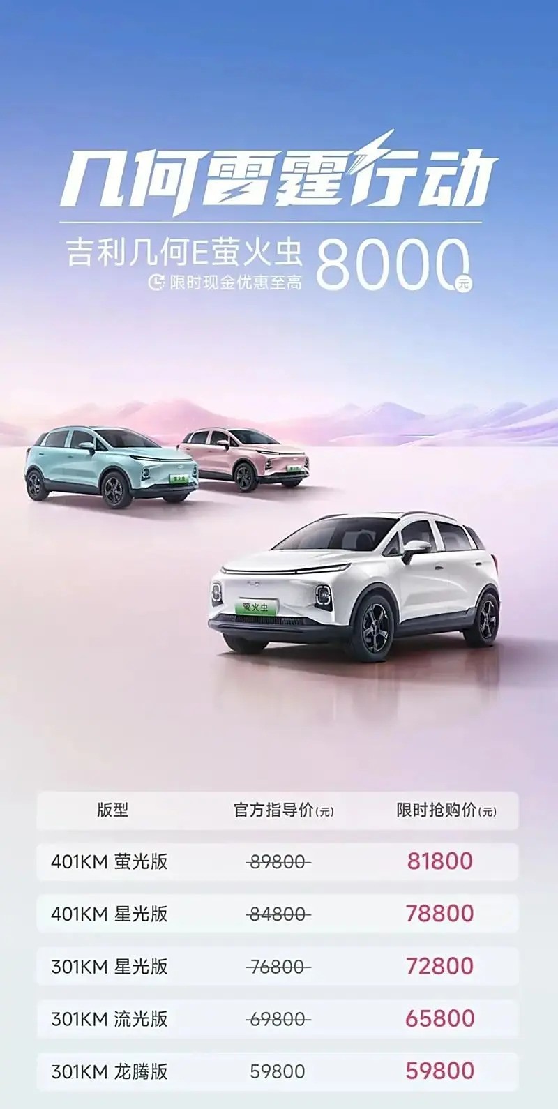 吉利汽车官方宣布,其旗下小型SUV——几何E萤火虫车型将推出限时优惠活动。此次活动时间为7月31日前购车的用户可享受最高8000元的现金优惠,并且还有首任个人非营运车主三电终身质保、24期0首付且年费率低至0.99%的金融方案,以及首任车主免费获赠价值3000元的专属充电桩及安装服务等多重购车权益。