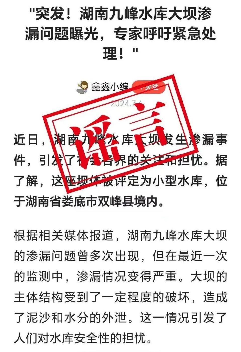 经核实,双峰县的九峰水库位于荷叶镇,目前大坝安全可控,经巡查未发生任何管涌等险情。该账号编造虚假信息,将岳阳某县改为娄底市双峰县,并发布到网上。网信部门已将谣言线索移送公安机关,依法依规打击处理。