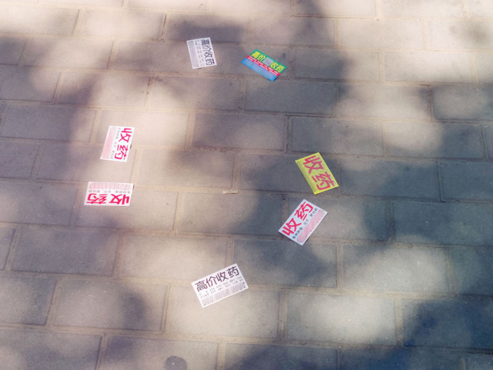 但在人行道两侧的草丛中、共享单车的车篮里以及附近的垃圾桶内,南方周末记者依然可以捡到不少收药的名片。加大加粗的“收医保药”“特高价收药”很容易引起过往行人的注意,距离三四米远也能看清名片上的字。
