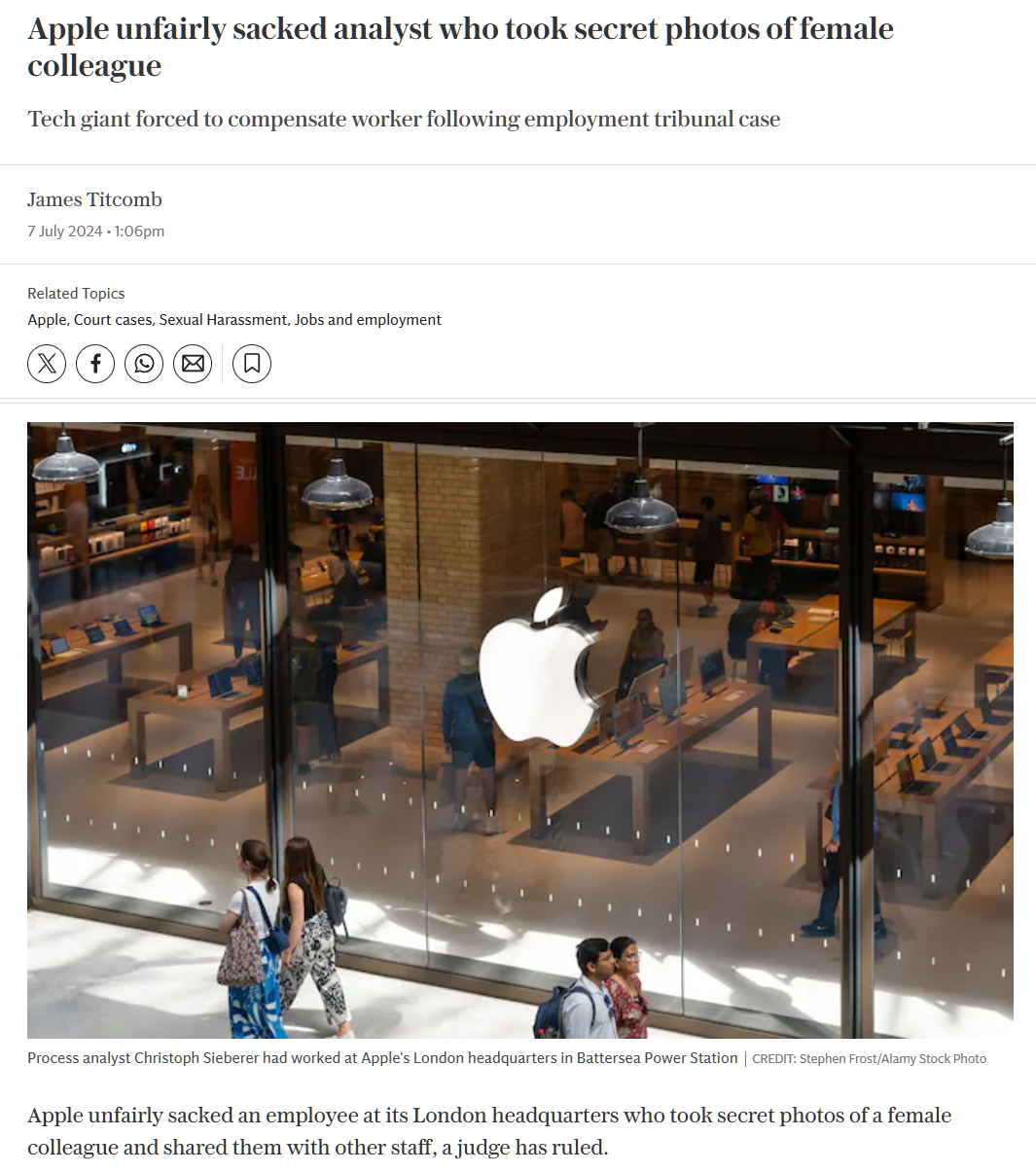 然而,这名女同事向经理告发后,调查发现苹果以“性骚扰”为由解雇了 Christoph Sieberer 和 Thomas。英国就业法庭判定这一行为“不公平”,并批评了苹果公司的“模糊不清”的“骚扰政策”。法官指出,在“到处都有摄像头的世界里”,这些照片不应被拍摄,而 Christoph Sieberer 已承认自己的行为不当。