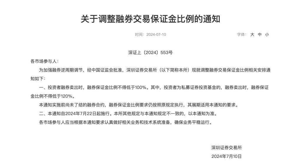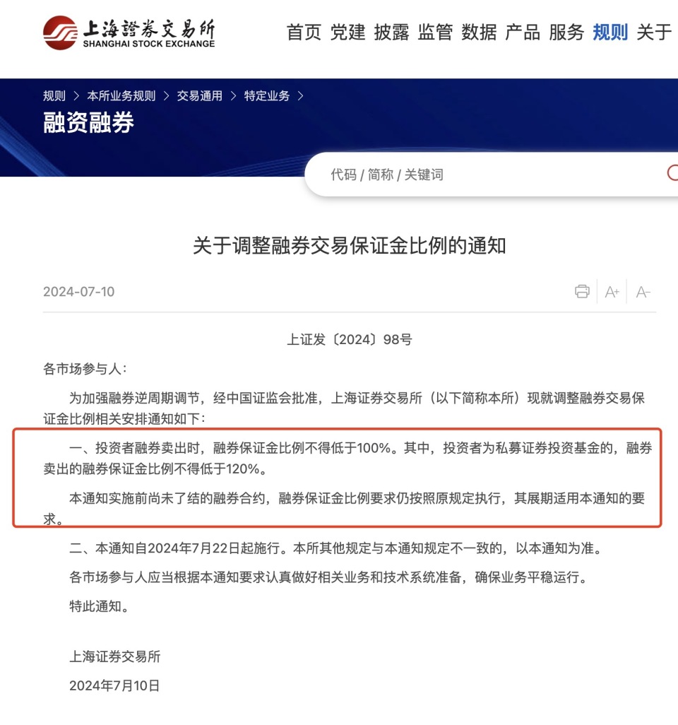 证监会批准证券交易所将融券保证金比例由不得低于80%上调至100%,私募证券投资基金参与融券的保证金比例由不得低于100%上调至120%,自2024年7月22日起实施。
