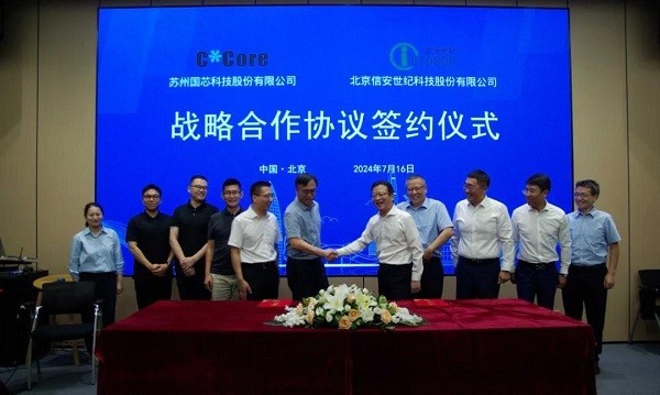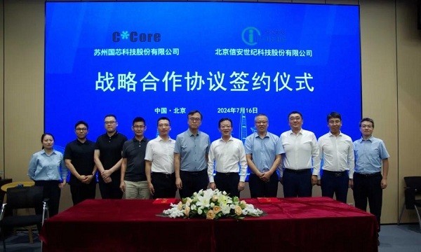7月16日,北京信安世纪科技股份有限公司(以下简称“信安世纪”,股票代码:688201) 与苏州国芯科技股份有限公司(以下简称“国芯科技”,股票代码688262)在北京正式签署战略合作协议,信安世纪董事长李伟、高级副总裁张庆勇,国芯科技总经理肖佐楠、副总经理艾方等领导出席签约仪式。