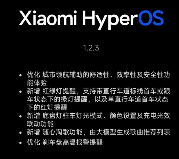 在城市领航辅助功能方面,此次OTA升级增加了不同车道的红绿灯提醒功能,并对底盘驻车灯光模式进行了调整。此外,还新增了随心淘歌等功能。同时,小米汽车还对刹车盘高温报警提醒进行了优化。