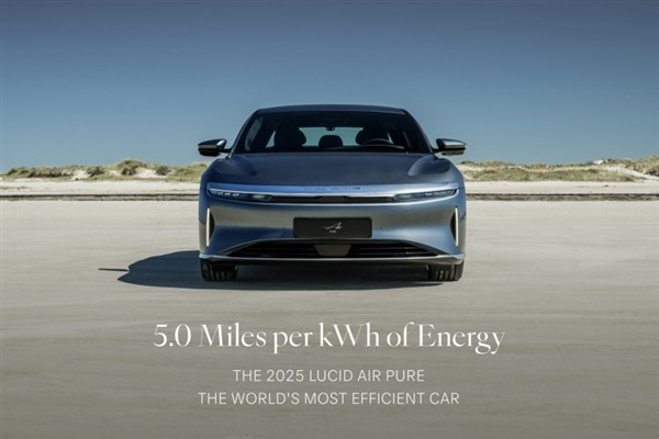 值得关注的是,2025款Lucid Air Pure车型更换为新的84kWh电池,实现了675.92英里(约1084.3公里)的EPA续航里程。如果按照每英里消耗1度电来计算,这辆车每百公里耗电约为12.43kWh,在电动汽车中被认为具有较高效率。相比之下,特斯拉Model S的百公里耗电量约为10kWh。