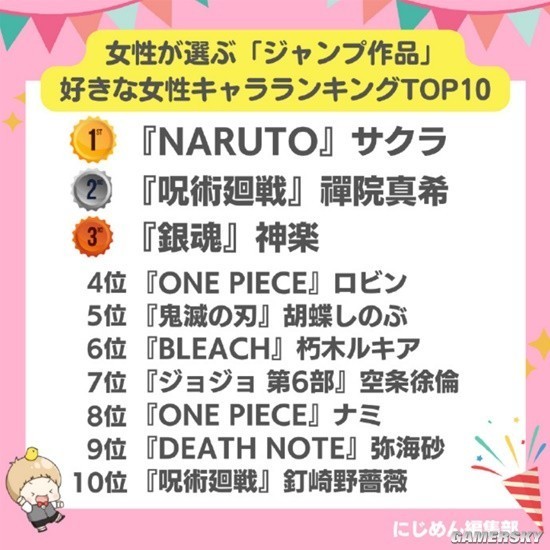 然而,在男榜方面,《海贼王》中的妮可·罗宾夺得了榜首位置。第二至十名则被《鬼灭之刃》、《银魂》、《JOJO的奇妙冒险 石之海》等作品的角色占据。