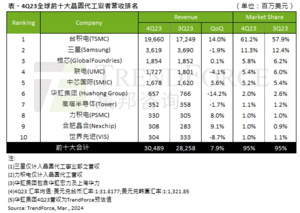 (23Q4全球晶圆代工营收排名,来源:TrendForce)