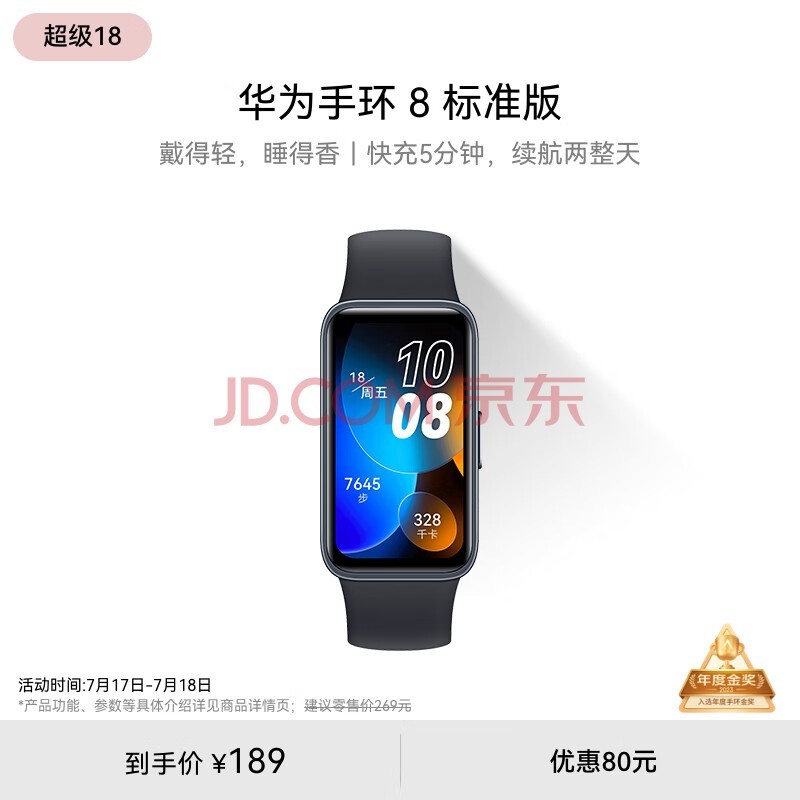 华为手环8于2023年4月发布,售价为NFC版的309元。目前京东活动价为169元,下单可领取40元优惠券和20元补贴券。这款手环重量减少12.5%,厚度减少10%。它采用轻薄立边全面屏设计,共有幻夜黑、樱语粉、翡冷翠、活力橙4种配色,搭载了1.47英寸炫彩大屏,并支持超过10000个精美表盘和智能穿搭表盘。
