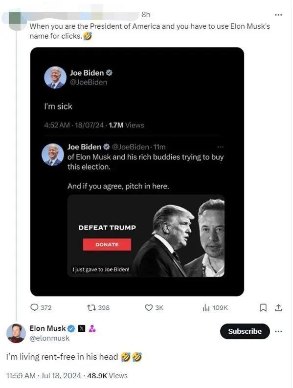 17日晚些时间,马斯克在一名网友讽刺拜登“利用埃隆·马斯克的名字炒作”的评论底下回复道,“我在他脑海里挥之不去(直译为,我免费住在他的脑子里)”并配上了两个“笑哭”的表情包。