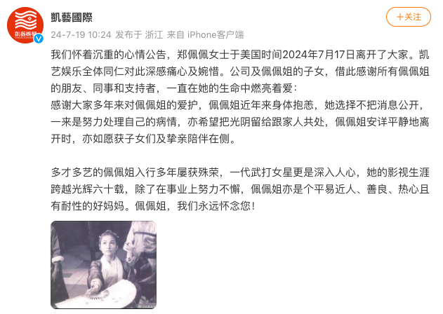 7月19日,郑佩佩经纪公司发文称,郑佩佩女士于美国时间2024年7月17日离开了大家。