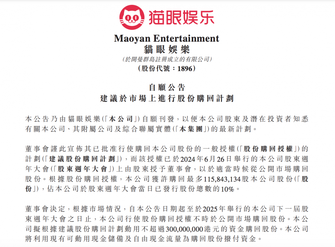 猫眼娱乐在香港交易所公告,根据市场情况,自本公告日期起直至2025年举行的下一届股东周年大会之日止,公司有权在公开市场上回购股份。该公司计划使用不超过3亿港元的资金来进行回购。
