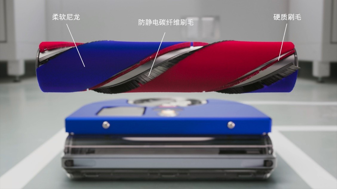 其次是刷条的三合一设计,在以往的吸尘器上,我们通常会根据不同材质的地面配备不同刷条的吸头来满足清洁需求,但对于吸尘机器人而言是无法频繁更换刷条的。因此,戴森将软绒尼龙(适用硬质地面,吸附大颗粒物)、防静电碳纤维刷毛(深入地面缝隙,吸起微尘)、硬质刷毛(适用地毯深度清洁或毛发清洁),三种不同材质融入到一根刷条之中,以更好的应对复杂的家居地面环境。