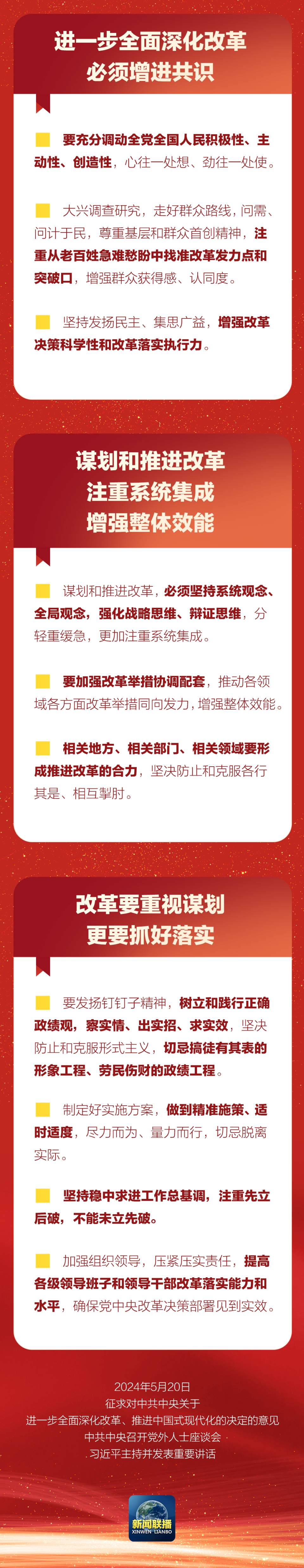 转载:https://new.qq.com/rain/a/20240719A09WRC00 2024-07-19 22:00·国际在线·发布于北京 中共中央5月20日在中南海召开党外人士座谈会,就中共中央关于进一步全面深化改革、推进中国式现代化的决定听取各民主党派中央、全国工商联负责人和无党派人士代表的意见建议。中共中央总书记习近平主持座谈会并发表重要讲话。 关于进一步全面深化改革,总书记有哪些重要论述?一起学习↓↓↓ 总监制丨闫帅南 监制丨李浙 主编丨柴婧 编辑&视觉丨马玮璐 潘杨 校对丨高少卓