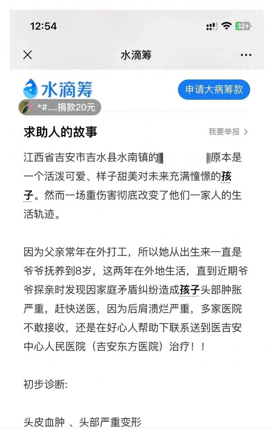 据网友发布的水滴筹截图显示,该女孩为江西吉安市吉水县水南镇人,父亲常年在外打工,其由爷爷抚养到8岁后,这两年在外地生活。近期爷爷探亲时发现孩子头部肿胀严重,送医后因后肩溃烂严重,多家医院不敢收治,后在好心人帮助下送至吉安某医院治疗。