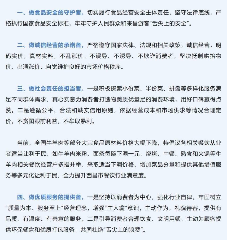 《倡议书》提到,发布降价倡议,旨在进一步优化餐饮行业服务质量,有效防范食品安全风险,提升人民群众美食消费体验,营造欢乐祥和的节日氛围,擦亮西昌特色美食品牌,持续推动西昌餐饮行业高质量发展。