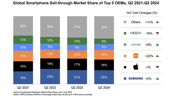 尽管三星、苹果、小米、vivo和OPPO等头部手机制造商在2024年第二季度占据了靠前位置,但它们仍然面临着华为等品牌带来的压力。Counterpoint指出,尽管这些头部品牌的市场份额与去年相比有所下降(小米上升,vivo不变),但它们仍然拥有较大的市场空间。