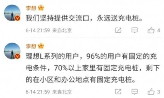 此前,理想汽车CEO李想曾发微博称公司坚持提供交流口、永远送充电桩。不过,此微博现已删除。