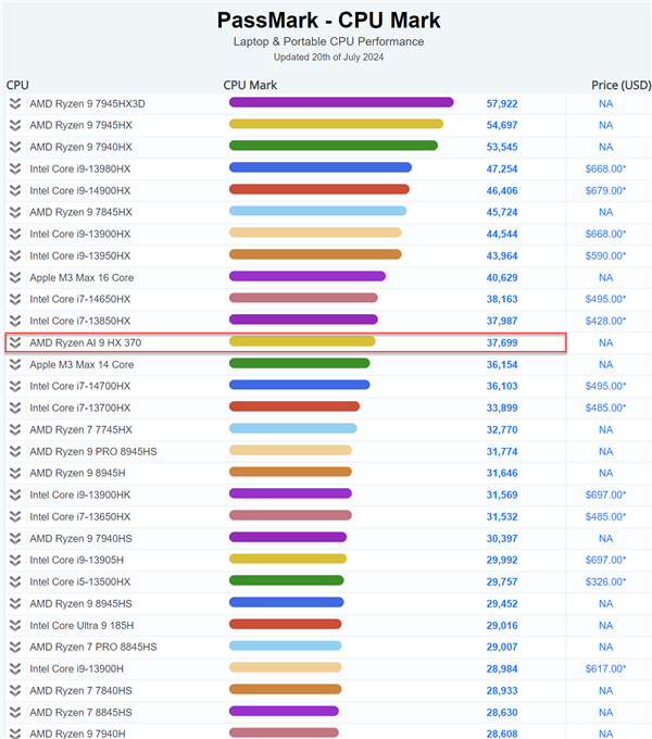 根据最新消息,AMD的最新旗舰级APU锐龙AI 9 HX 370在PassMark基准测试中表现突出,超越了苹果的M3 Max(14核)和英特尔的i7-14700HX。这款12核心24线程的处理器在单核测试中获得了4213分,在多核测试中达到了37699分,使其成为PassMark数据库中排名第12的笔记本处理器。
