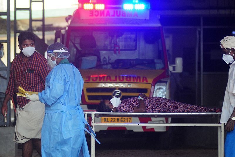 △去年9月,喀拉拉邦一家医院内,医护人员将一名出现尼帕病毒感染症状的病人转移到隔离病房。